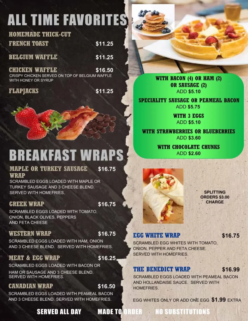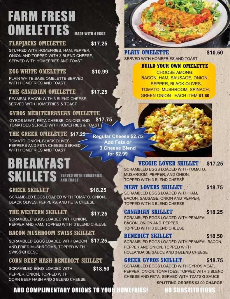 Omelettes, skillets, breakfast platters & combos, waffles to flapjacks, all day long! Affordable & delicious!