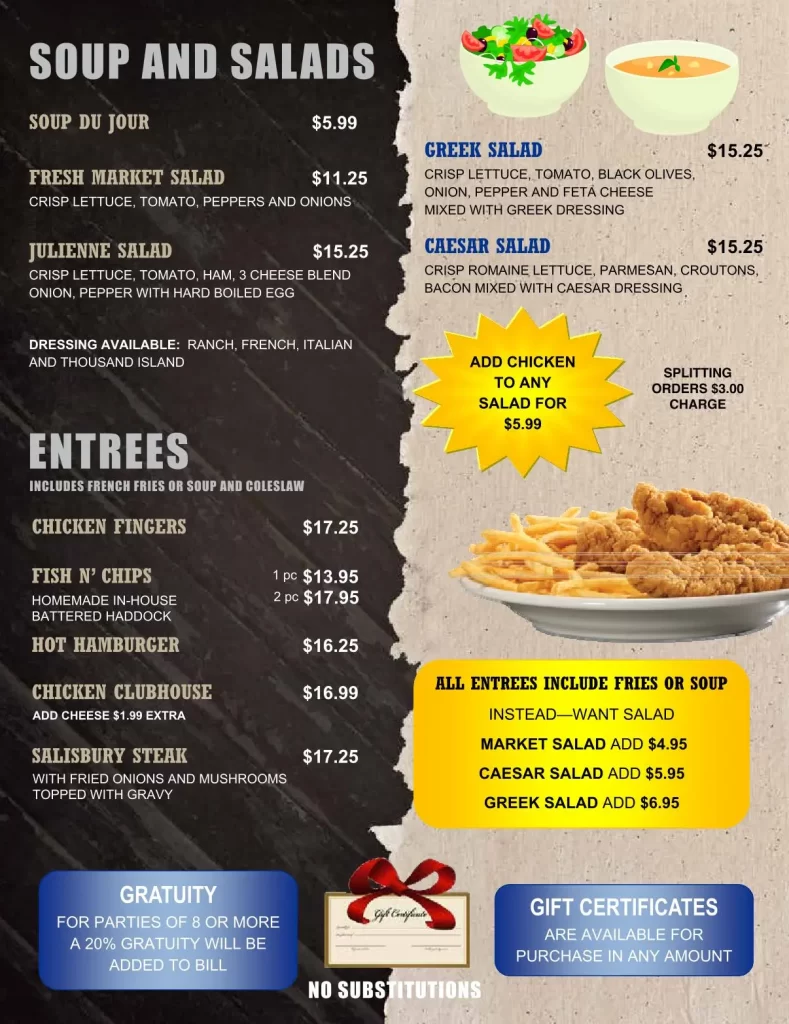 From chicken fingers to our customer favourite fish & chips, all entrees include fries or soup. Mouth watering selections!