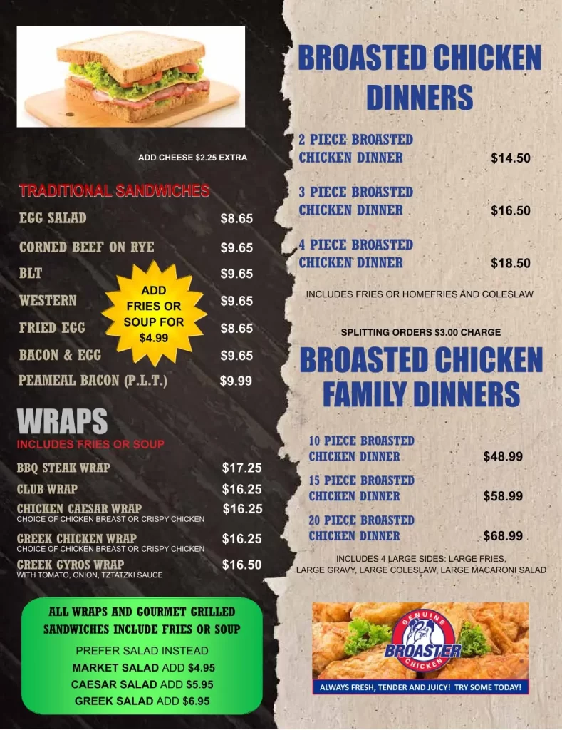 Original recipe burgers with plenty of options, delicious wraps, traditional & gourmet sandwiches with fries and/or soup plus much more!