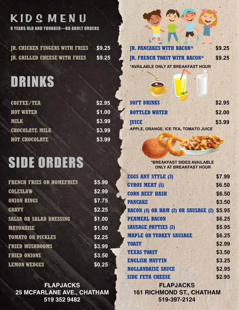 Locally owned and operated, serving all of Chatham-Kent, Flapjacks Lunch Shack is the go to place for all day breakfast, and affordable family dining. See for yourself why our customers are repeat customers. We kindly invite you to dine at one of our 2 Chatham-Kent locations, ready to serve you. We aim to give you a positive & pleasurable dining experience each time you come in.